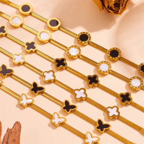 أساور بيضاء سوداء مستديرة رومانية مستديرة من الفولاذ المقاوم للصدأ برسيم فراشة سلسلة ثعبان مسطحة للبيع بالجملة للنساء